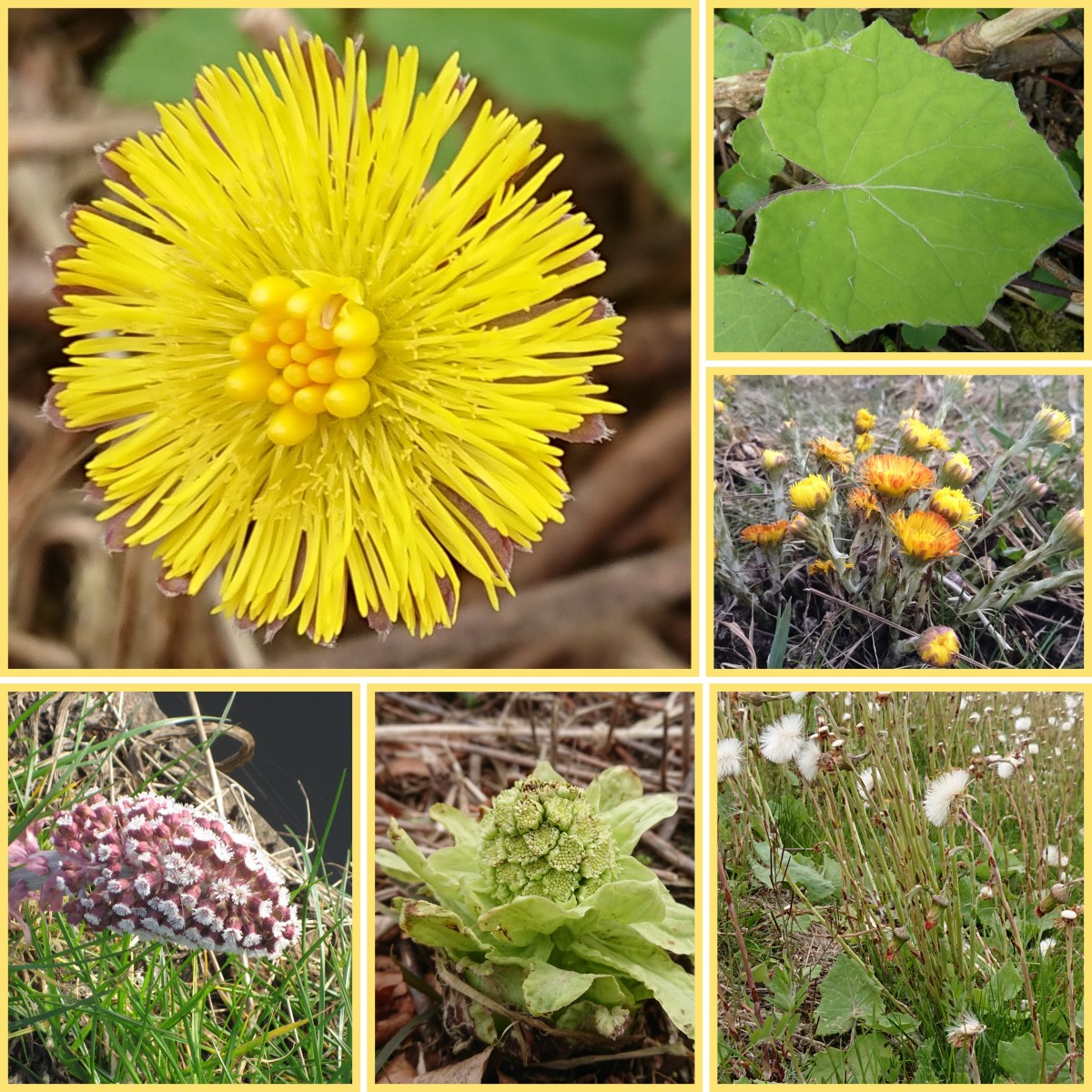 Naast klein hoefblad bestaat er ook 𝘨𝘳𝘰𝘰𝘵 𝘩𝘰𝘦𝘧𝘣𝘭𝘢𝘥, een samengesteldbloemige uit een ander geslacht. Ook deze bloeit voordat het blad verschijnt. Langs de Hollandsekade zag ik van deze plant al de eerste bloeistengels boven de grond komen (foto linksonder). Het blad van groot hoefblad lijkt wel wat op een rabarberblad. Verder komen ook al de bloeistengels van aangeplante hoefbladsoorten boven de grond zoals van 𝘑𝘢𝘱𝘢𝘯𝘴 𝘩𝘰𝘦𝘧𝘣𝘭𝘢𝘥 op landgoederen (foto midden onder).