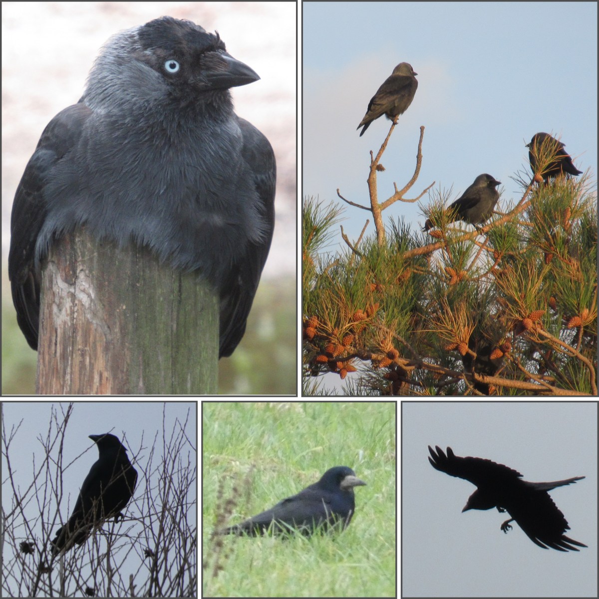 Morgen begint de Nationale Tuinvogeltelling: een half uur lang in je tuin vogels tuin tellen. Hiervoor heeft de Vogelbescherming een handig telformulier gemaakt. Daarop staan vier soorten die tot de familie van de kraaien horen. De 𝘦𝘬𝘴𝘵𝘦𝘳 (soort van dag 23) en de 𝘨𝘢𝘢𝘪 zul je niet zo gauw verwisselen met een andere soort. Verder staan de kauw en de 𝘻𝘸𝘢𝘳𝘵𝘦 𝘬𝘳𝘢𝘢𝘪 op het formulier. Beiden worden door veel mensen ‘kraai’ genoemd, maar de verschillen zijn duidelijk. De zwarte kraai (links onder) is vrij groot en helemaal zwart. De kauw (bovenaan) is kleiner en donkergrijs met een zilvergrijs achterhoofd. De ogen van de kauw hebben bovendien een opvallende lichtblauwe iris.