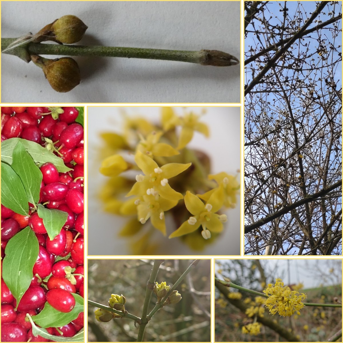 Een gele kornoelje kan tot zes meter hoog worden. De groene twijgen zitten grillig door elkaar. Als de bloemen bloeien, heeft de struik een gele waas. De bloemen zijn klein, geel en viertallig en staan in schermen bij elkaar. De kroonblaadjes vormen een kruis. De nectar is makkelijk bereikbaar en daardoor trekt deze struik naast vroeg vliegende bijen ook vliegen aan. In de nazomer zit de struik vervolgens vol met rode (wrange) steenvruchten. Deze worden al vanouds door mensen gegeten, als compote of ingelegd als ‘olijven’.