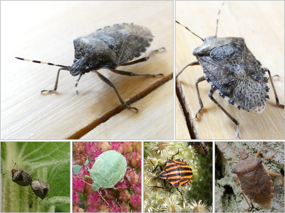 De grauwe schildwants zag ik afgelopen tijd meerdere malen in ons huis. Zaterdag zag ik buiten op een linde de snuitkeverschildwants (onderaan rechts), een rover die kevers en hun larven eet. Daarnaast zie je de pyamaschildwants; deze leeft op schermbloemigen en zag ik afgelopen zomer in de Achterhoek op wilde peen. De groene is de groene schildwants, een algemeen voorkomende soort van bosranden en struwelen. En tenslotte links onderaan: de andoornschildwants, een vrij kleine soort die leeft op lipbloemigen.