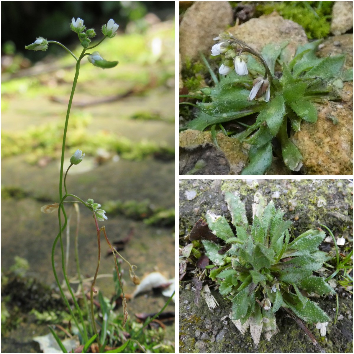 De bladrozetten van de vroegeling zijn er al vanaf oktober; hier en daar verschijnen nu ook de eerste bloemen (zie foto rechtsboven). De rozetjes zijn maar zo’n 2 cm in doorsnee en de blaadjes zijn spatelvormig en behaard (zie foto rechtsonder).