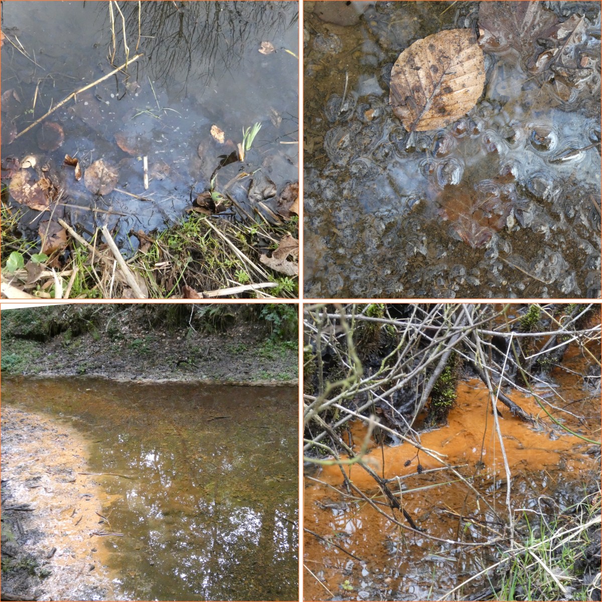 Soms zie je op water een olieachtig laagje, met allerlei kleuren. Als je het aanraakt en het breekt in hoekige stukken, dan is het geen olie maar een vliesje waarin ijzerbacteriën zitten, dus een natuurlijk verschijnsel. (Als het laagje na verstoren weer snel samenvloeit, dan heb je wel te maken met olie.)
