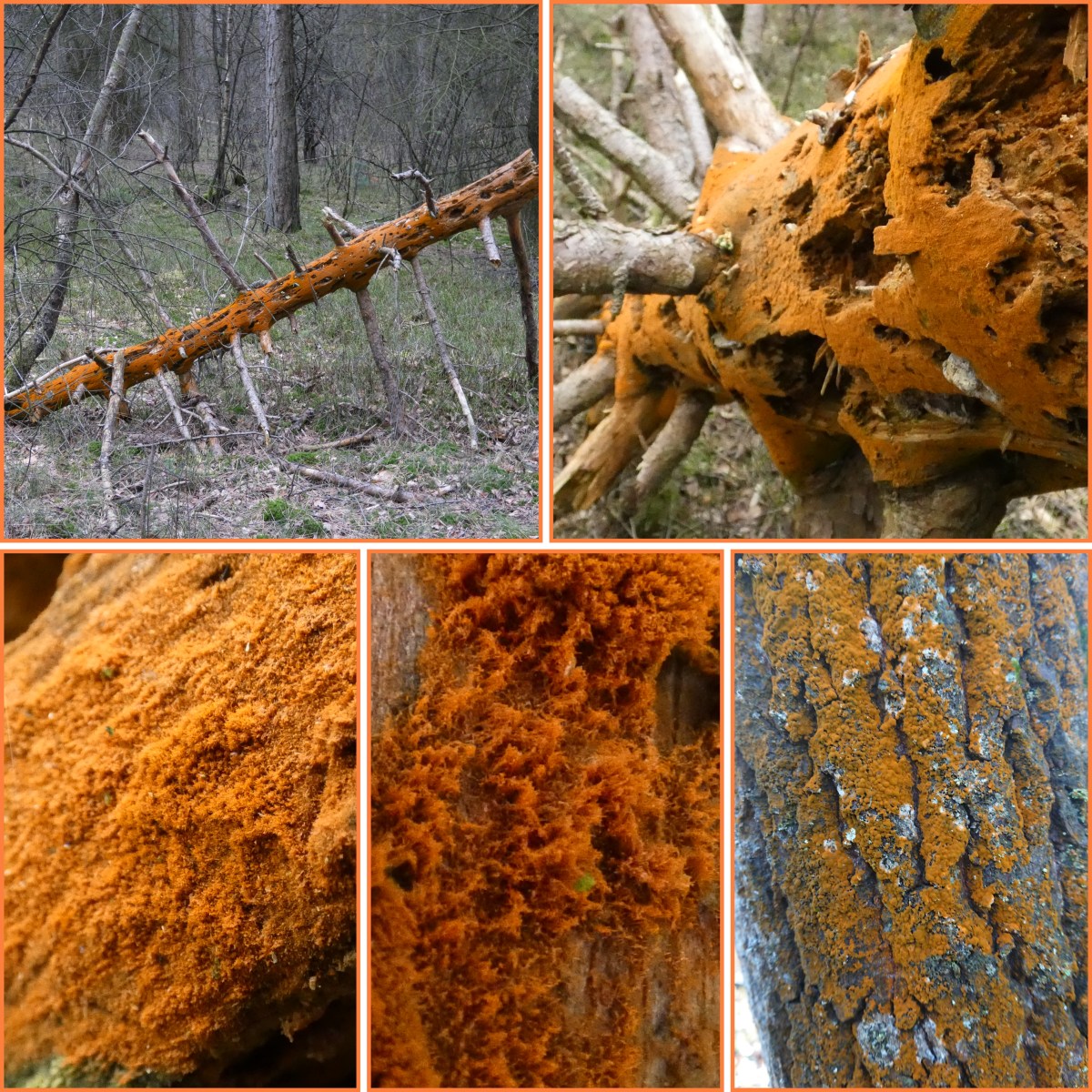 Afgelopen vrijdag zag ik bij Boeschoten op de Veluwe een knaloranje boomstam. Ik zie wel eens vaker bomen met oranje ‘aanslag’ op de stam (zoals op de foto rechts onder), maar niet eerder zoveel en zo intens oranje als op deze dode naaldboom. Het gaat om draadvormige groenwieren (algen), behorend tot het geslacht Trentepohlia. Op internet kom je namen tegen als oranje boomalg, Portugese (rode) alg en oranjerood groenwier. De verschillende soorten schijnen alleen microscopisch van elkaar te onderscheiden te zijn. Dus ik houd het maar bij de wetenschappelijke geslachtsnaam Trentepohlia. Trentepohlia-soorten vind je niet alleen op boomstammen en struiken, maar ook op vochtige rotsen. Sommige soorten leven in symbiose met een schimmel in korstmossen.