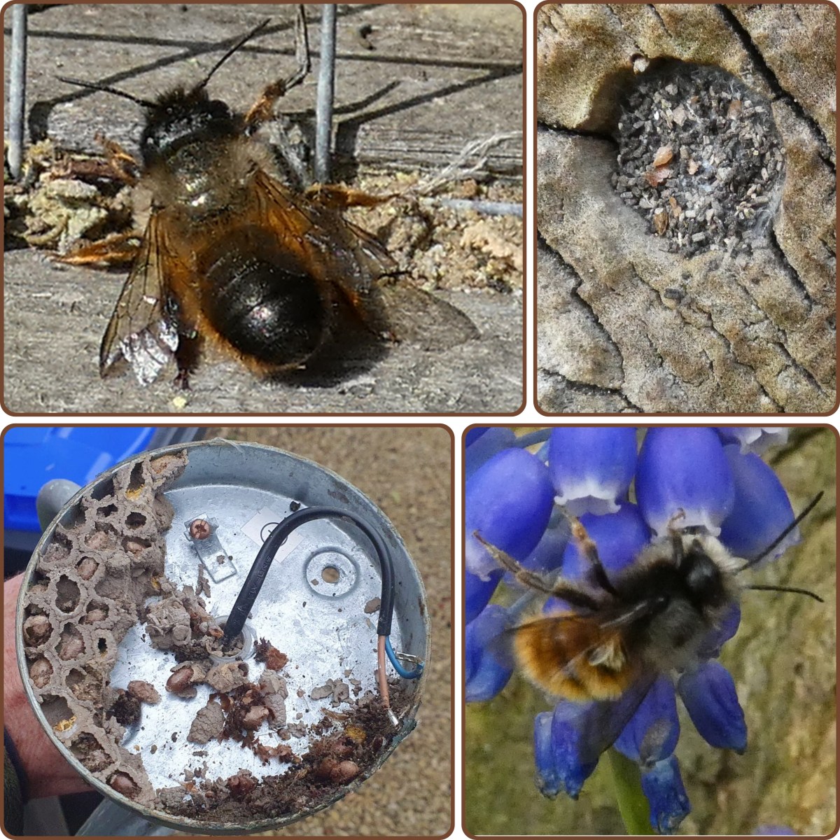 Op de foto’s zie je rechtsboven een dichtgemetseld gat in een stuk hout in onze tuin. Rechtsonder zie je een andere soort metselbij: de gehoornde metselbij. Die staat ook in de bijengids van de Nationale Bijentelling.