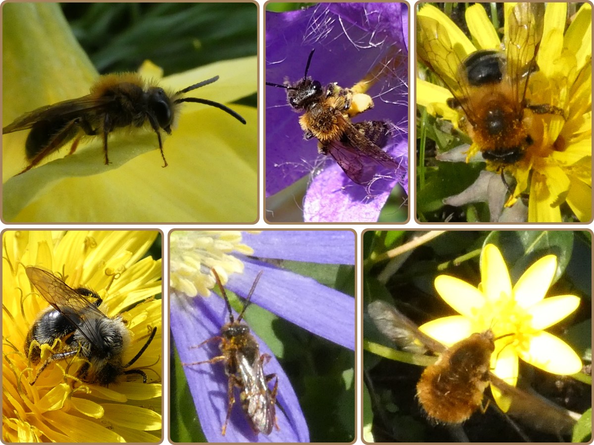 De insecten van de collage heb ik allemaal in onze tuin gefotografeerd. Op de bovenste rij zie je van links naar rechts het roodgatje, de tweekleurige zandbij (vorig jaar) en de viltvlekzandbij. Onderaan links zie je een onbekende zandbij zich heerlijk wentelen in het stuifmeel van een paardenbloem. De twee andere insecten zijn geen zandbijen, maar zijn zogenaamde broedparasieten. Beide zag ik afgelopen dagen in onze tuin.