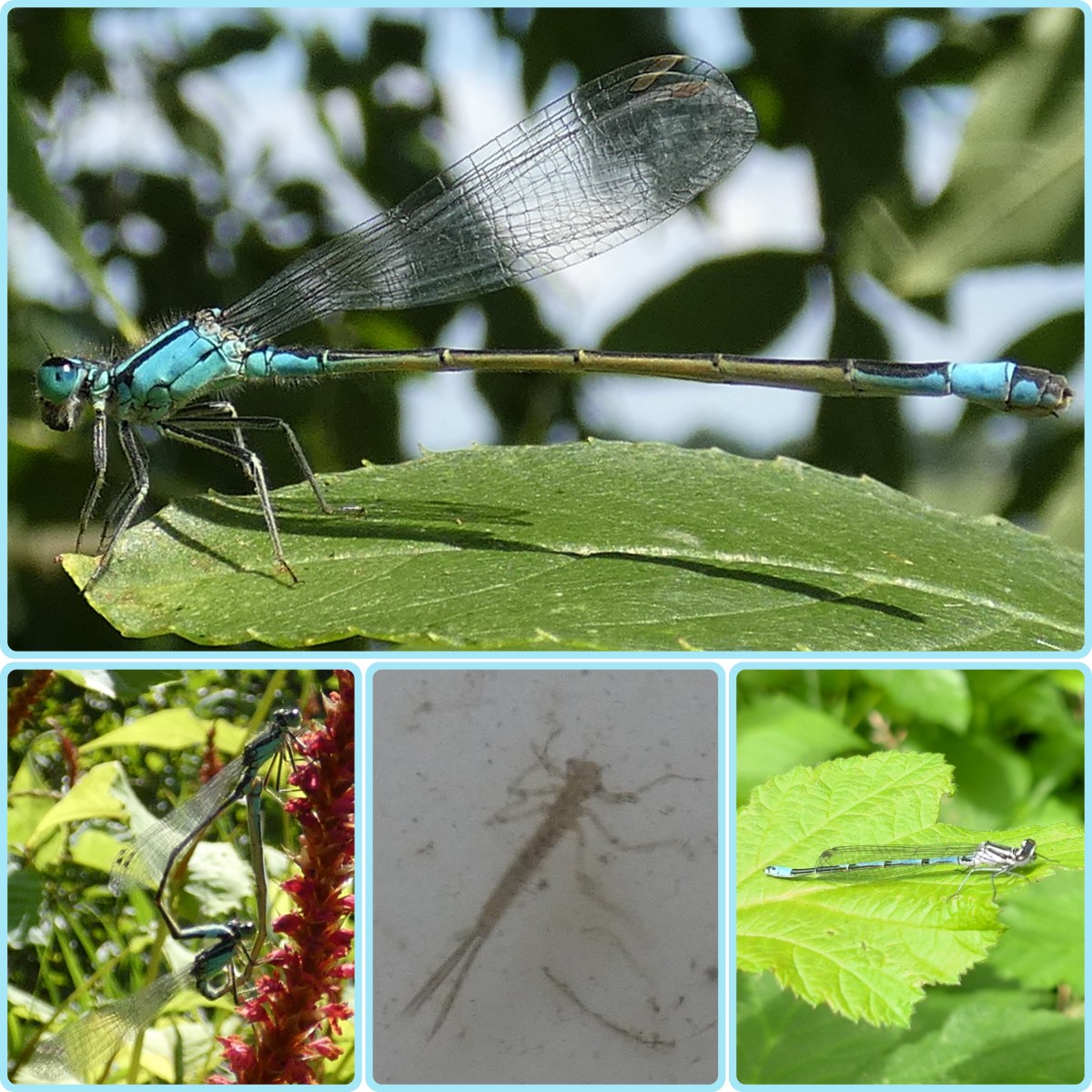 De paring gaat niet bepaald zachtzinnig. Als het mannetje het vrouwtje in de juiste houding heeft, vormen ze een paringsrad (foto links onder). Waterjuffervrouwtjes zetten de eitjes op waterplanten af. Libellenlarven vervellen een aantal keer. De laatste vervelling naar imago (volwassen insect) wordt uitsluipen genoemd. De volgroeide larve klimt het water uit en gaat op een plantenstengel zitten. De huid van kop en borststuk barst open en heel langzaam komt de volwassen libel eruit. De libel blijft nog even hangen (uitharden) en vliegt vervolgens naar een boom of struik. Lantaarntjes overwinteren als larve (één winter). Na de paring en de afzetting van de eitjes zijn de volwassen juffers binnen een paar dagen dood.