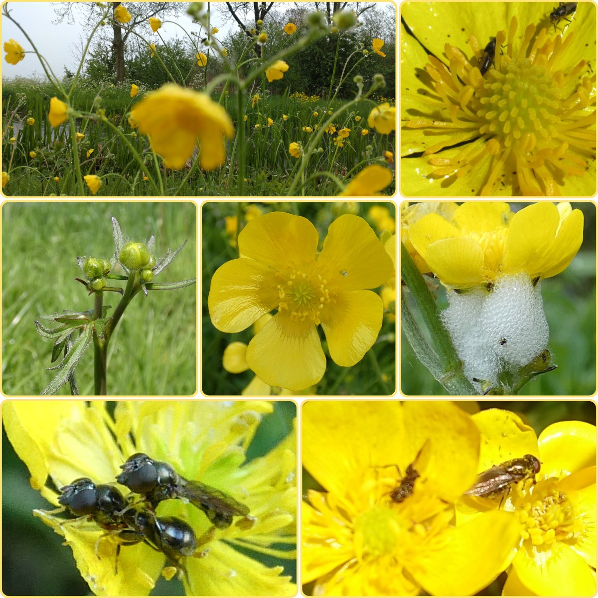 Ik ben weer op zoek gegaan naar foto’s met bloembezoekers. Van rechtsboven met de klok mee: wenkvliegjes, schuimcicade, weidedoflijfjes (een vliegensoort) en (vermoedelijk) een soort zweefvlieg.