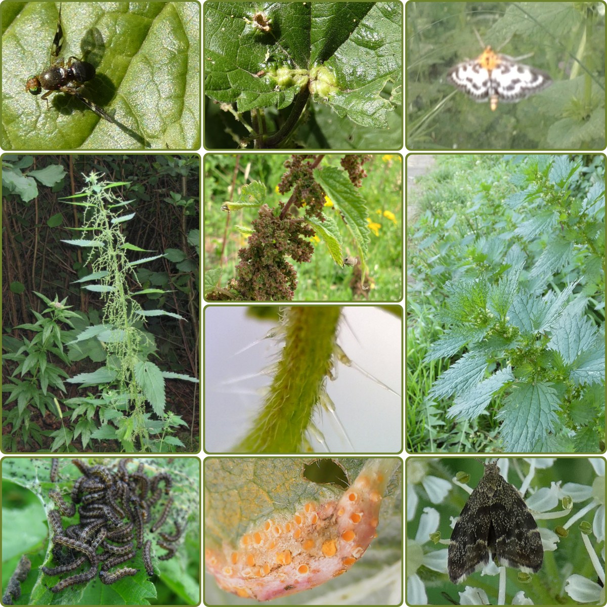 Op de foto’s zie je bovenaan: brandnetelboorvlieg, gallen op brandnetelblad, bonte brandnetelmot. Midden: grote brandnetel, zaden en brandharen, kleine brandnetel. Onder: rupsen van de kleine vos, brandnetel-zeggeroest, brandnetelmot.
