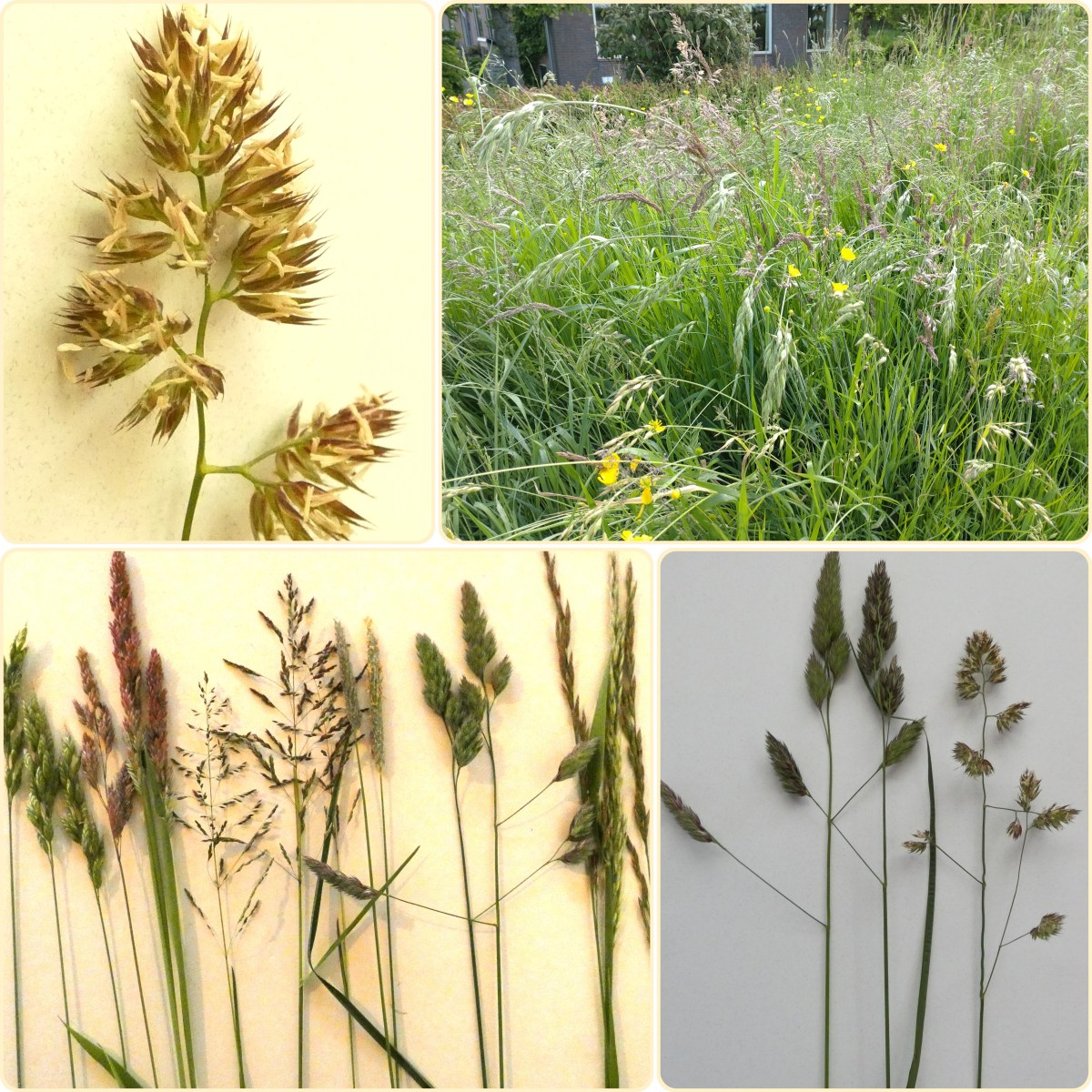 Op de foto’s zie je rechtsboven een stukje dijk pal voor ons huis. De grassen die hierin opvallen en nu (bijna) bloeien, heb ik geplukt en naast elkaar gelegd (foto linksonder). Van links naar rechts: zachte dravik, gestreepte witbol, een beemdgras, grote vossenstaart, kropaar en glanshaver. Het stuk wordt onderhouden door het waterschap: twee keer per jaar wordt er gemaaid en afgevoerd (nadat het gras een paar dagen is blijven liggen). Het randje pal langs de weg maaien we zelf regelmatig. De eerste meter wordt door de gemeente geklepeld, voor de verkeersveiligheid. Dit jaar zijn ze nog niet langs geweest. In dit stuk staat vooral zachte dravik, een eenjarig gras. Twintig jaar geleden is de kade versterkt en is er nieuwe klei aangebracht.