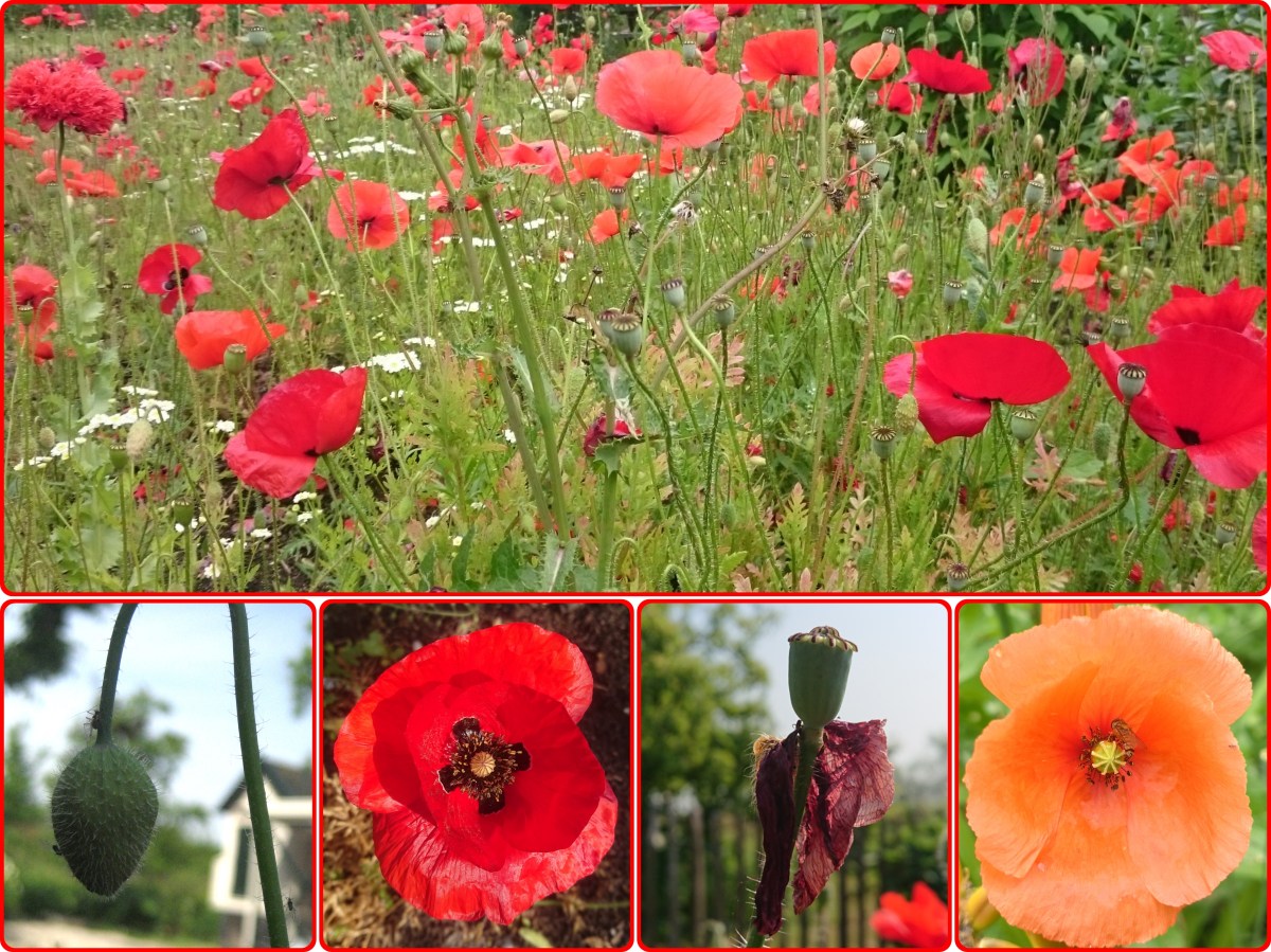 Terug naar de grote klaproos. Voor de bloei zijn de knoppen geknikt. De bloem wordt geheel omgeven door twee kelkbladen die bij het ontluiken eraf vallen. De vier kroonbladen van de grote klaproos zijn vuurrood, met meestal een zwarte vlek aan de voet. De kroonbladen zijn groot en breder dan lang; ze overlappen elkaar voor een groot deel. Ook kunnen ze lichter van kleur zijn, tot wit aan toe. De bloemen bevatten geen nectar, maar leveren wel veel stuifmeel. Hier komen allerlei insecten op af. In onze tuin zie ik er verschillende soorten hommels en zweefvliegen op. De insecten worden gelokt door de grote kroonbladen die zij overigens niet als rood maar als ultraviolet zien.