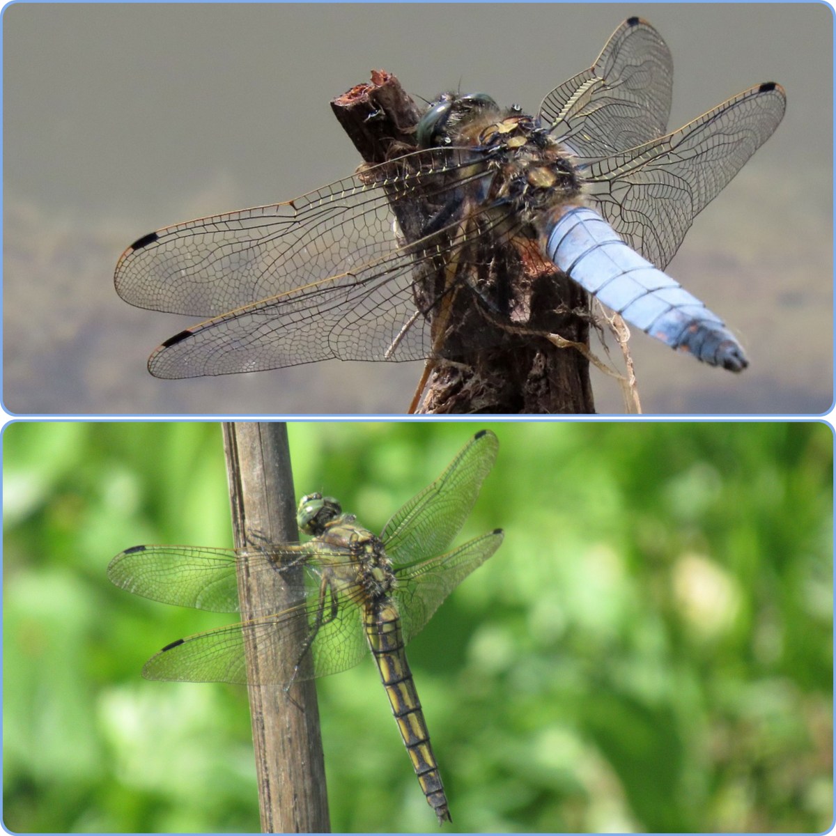 Op de foto’s zie je de gewone oeverlibel, de grootste en algemeenste libel van Nederland. Boven zie je een mannetje (een afbeelding van Aad Kleijweg via Pixabay) en onder een vrouwtje (een eigen foto).