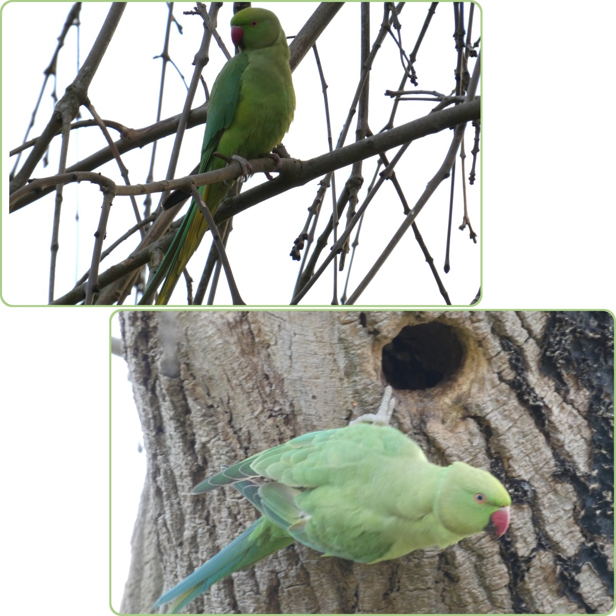 Halsbandparkieten zijn opvallende, knalgroene en luidruchtige vogels. Mannetjes hebben een band die rond de nek roze en bij de keel zwart is. Vrouwtjes hebben die niet. Als ze vliegen, valt de lange staart op.