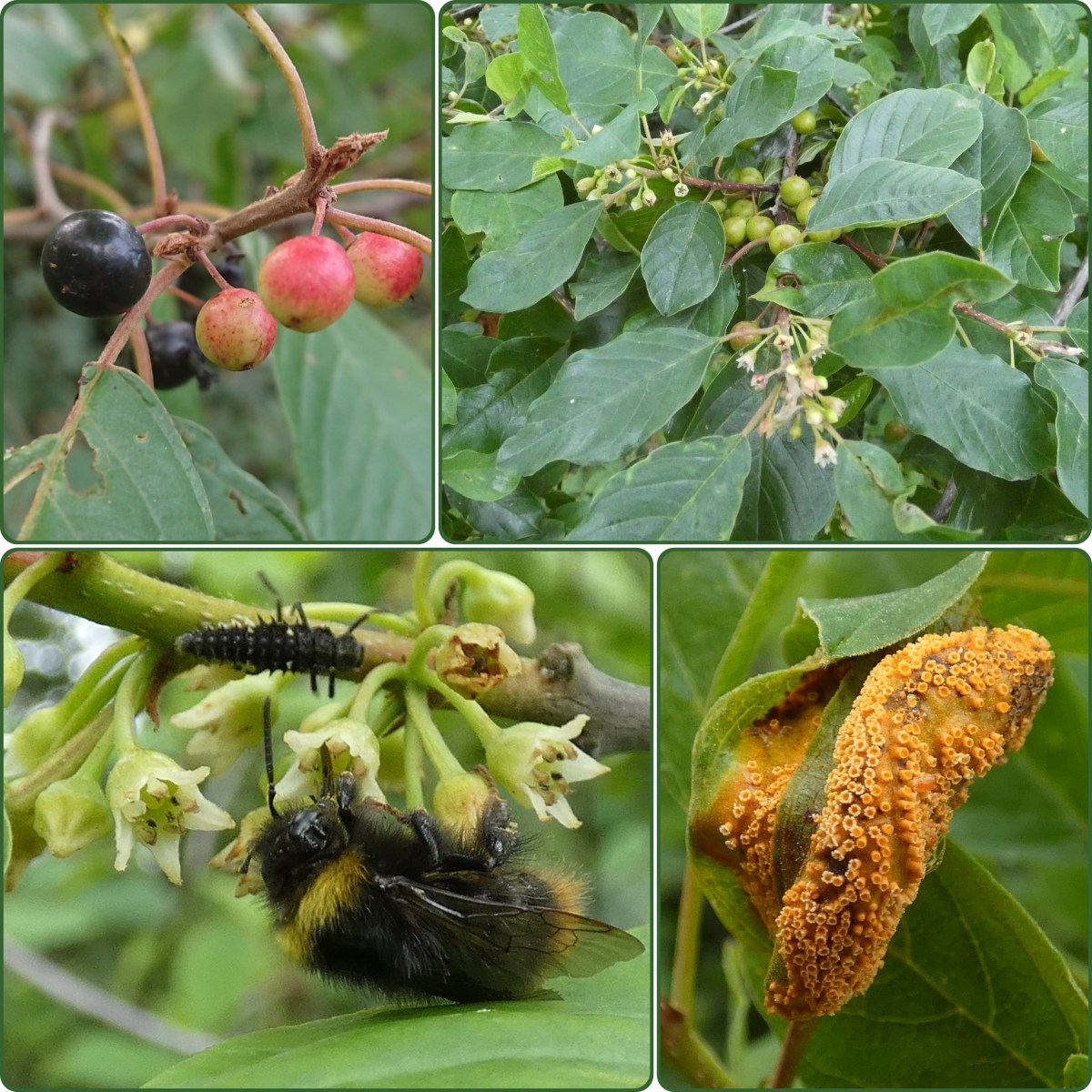 Vandaag aandacht voor een struik die al vaker genoemd is: sporkehout. Deze is ook bekend onder de naam vuilboom, een naam die ik zelf meestal voor deze struik gebruik. Sporkehout (en de verwante wegedoorn) zijn waardplanten voor de citroenvlinder en voor kroonroest. Maar er is meer over deze struik te vertellen.