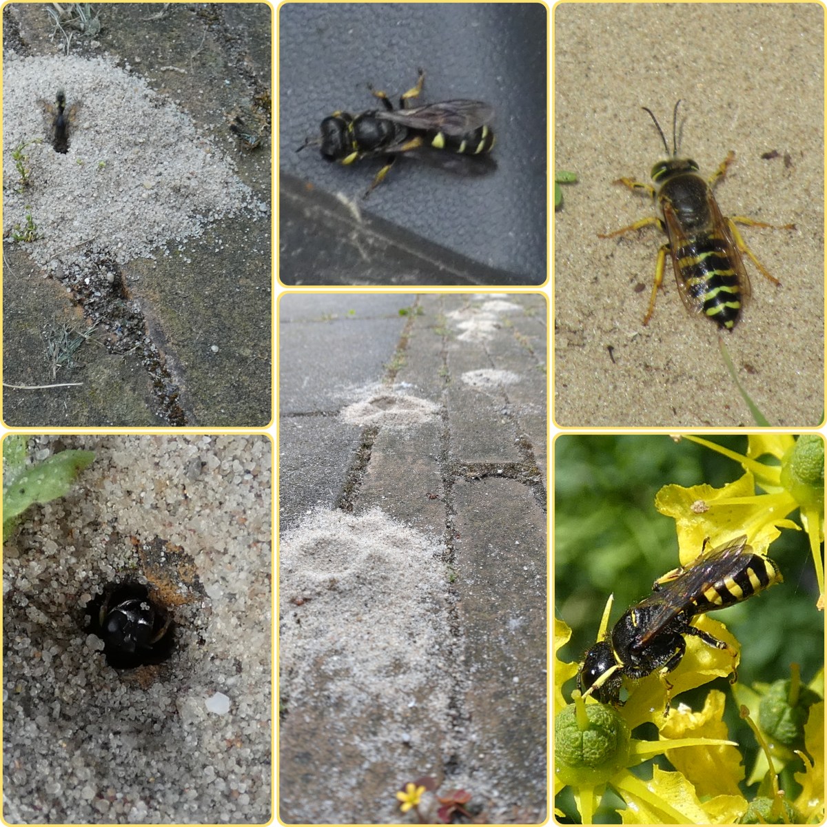 Op de foto linksboven zie je een graafwesp zijn holletje inschieten. Rechts van het hoopje zand, zie je als je goed kijkt, ook nog een prooi liggen. Links onderaan zie je een graafwesp naar buiten kijken of de kust veilig is.