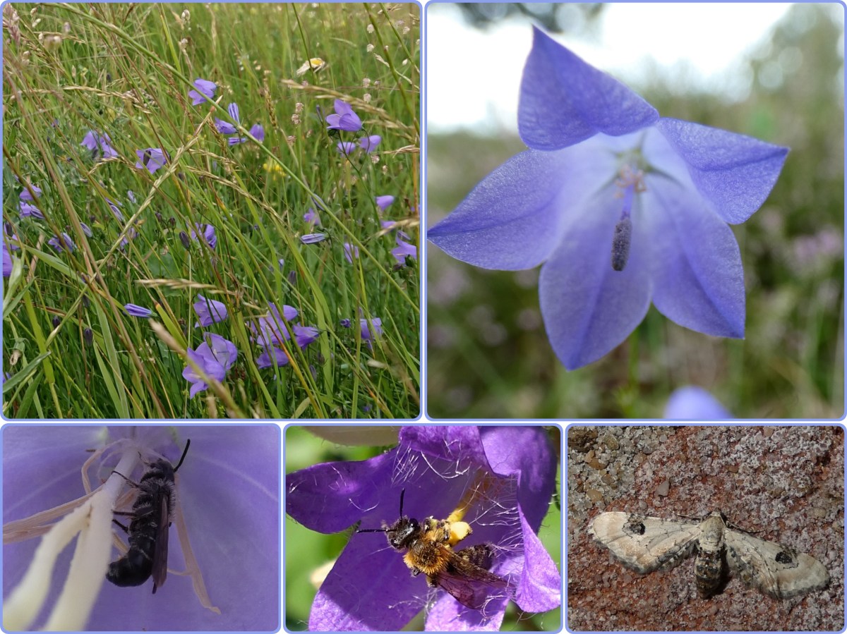 Klokjes worden vooral door bijen bezocht waaronder een aantal specialisten. Ook in onze tuin (dat buiten het gebied valt waarin klokjes van nature voorkomen) heb ik de grote klokjesbij gezien. Op de foto linksonder zie je een mannetje (gekromd achterlijf) op prachtklokje. De mannetjes slapen vaak in de klokjes door zich met hun kaken vast te klemmen. Ze blijven daar om te wachten op de vrouwtjes die later uitvliegen. Klokjesbijen zijn actief van begin mei tot eind augustus. Ze zijn ook te vinden op kaasjeskruid. Andere specialisten zijn bijvoorbeeld de gewone klokjeszandbij en de klokjesdikpoot. Op de foto onderaan in het midden zie je een tweekleurige zandbij op een klokje. Verder is er een snuitkever gespecialiseerd op klokjes. Ook zijn er vlinders zoals een aantal dwergspanners die klokjes (mede) als waardplant hebben. Een voorbeeld daarvan is de zwartvlekdwergspanner (foto rechtsonder).