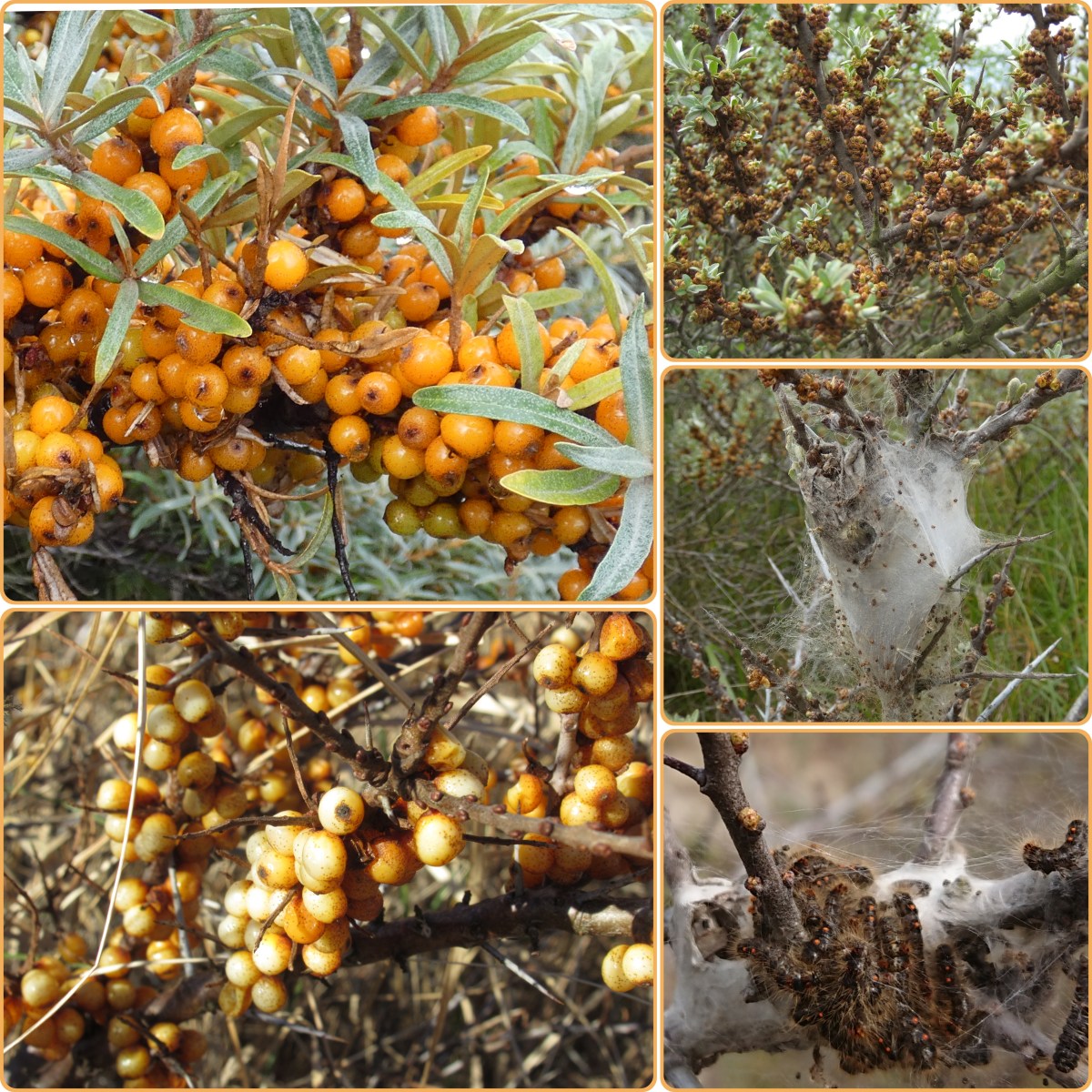 De (vrouwelijke) duindoornstruiken zitten momenteel vol oranje bessen, wachtend op vogels die ervan komen eten. Ook wij kunnen ze eten; de bessen zijn bovendien heel gezond. Soms zitten ze in februari nog aan de struiken (foto linksonder), maar die bessen gisten of zijn gewoon niet lekker meer. Vogels die er dan nog van eten, kunnen dronken worden.
