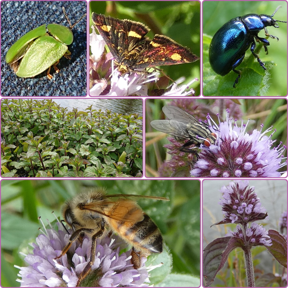 Een aantal insecten hebben watermunt als waardplant. Bovenaan links zie je de muntschildpadtor die flink te keer kan gaan op watermunt en van het blad dan alleen de middennerf achterlaat. Daarnaast het muntvlindertje dat munt maar ook andere lipbloemigen als waardplant heeft. En rechts de blauwe muntgoudhaan.