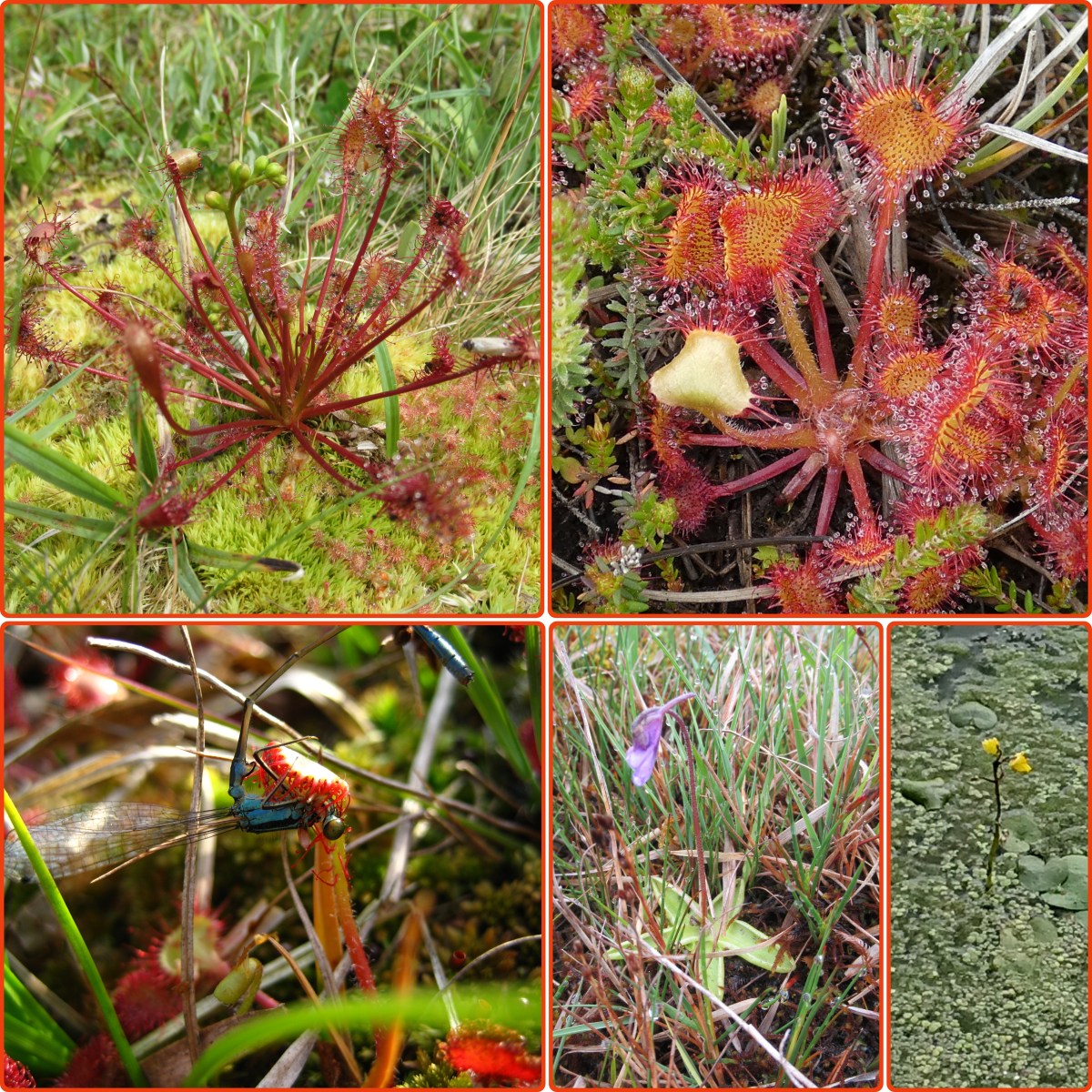 Kleine zonnedauw (foto linksboven) vind je op natte heide, bijvoorbeeld op afgeplagde stukken en andere verstoorde open plekken, en op oevers van vennen. Het is een kortlevende pioniersoort. Kleine zonnedauw heeft spatelvormige, omhooggerichte bladeren. Vooral muggen vallen ten prooi aan kleine zonnedauw.