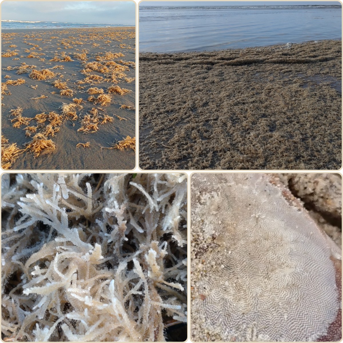 Toch kunnen we soms mosdiertjes of hun resten wel waarnemen. Zo zag ik een korstvormige mosdiertjeskolonie (zeekantwerk of zeevitrage genaamd) op de rug van een noordzeekrab (foto rechtsonder). Heel spectaculair zijn de afgestorven kolonies van het harige mosdiertje als die aanspoelen op het strand. Dat kan een meter hoge, stinkende laag opleveren. Op de foto’s bovenaan zie je aangespoelde mosdiertjes op Ameland in oktober 2021. In de zomer van datzelfde jaar was er een massale stranding die ook het nieuws haalde. Meer hierover vind je hier.