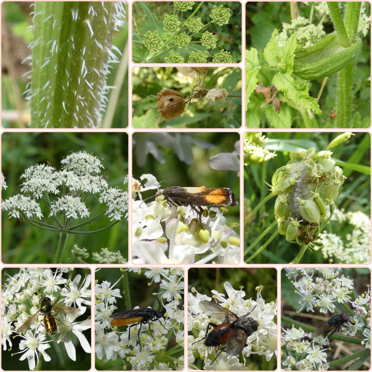 Op de foto in het midden rechts zie je de rups van het groot platlijfje (een grasmot) die zich ingespinseld heeft in een scherm. De rupsen van deze vlinder vind je ook op pastinaak en groot moerasscherm.