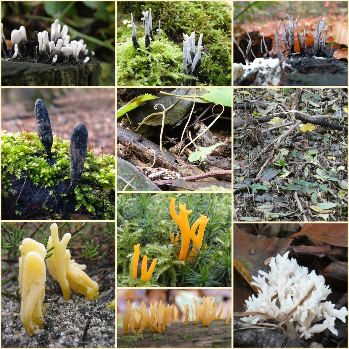 Tot dezelfde familie horen de koraalzwammen. Deze zijn vertakt en je hebt ze in allerlei kleuren. Op de foto rechtsonder zie je een van de witte koraalzwammen. Ze kunnen 4 cm hoog worden. Witte koraalzwammen zijn mycorrhiza-schimmels die samenleven met diverse loofboomsoorten. Je vindt ze in bossen en wegbermen op niet al te voedselarme bodems.