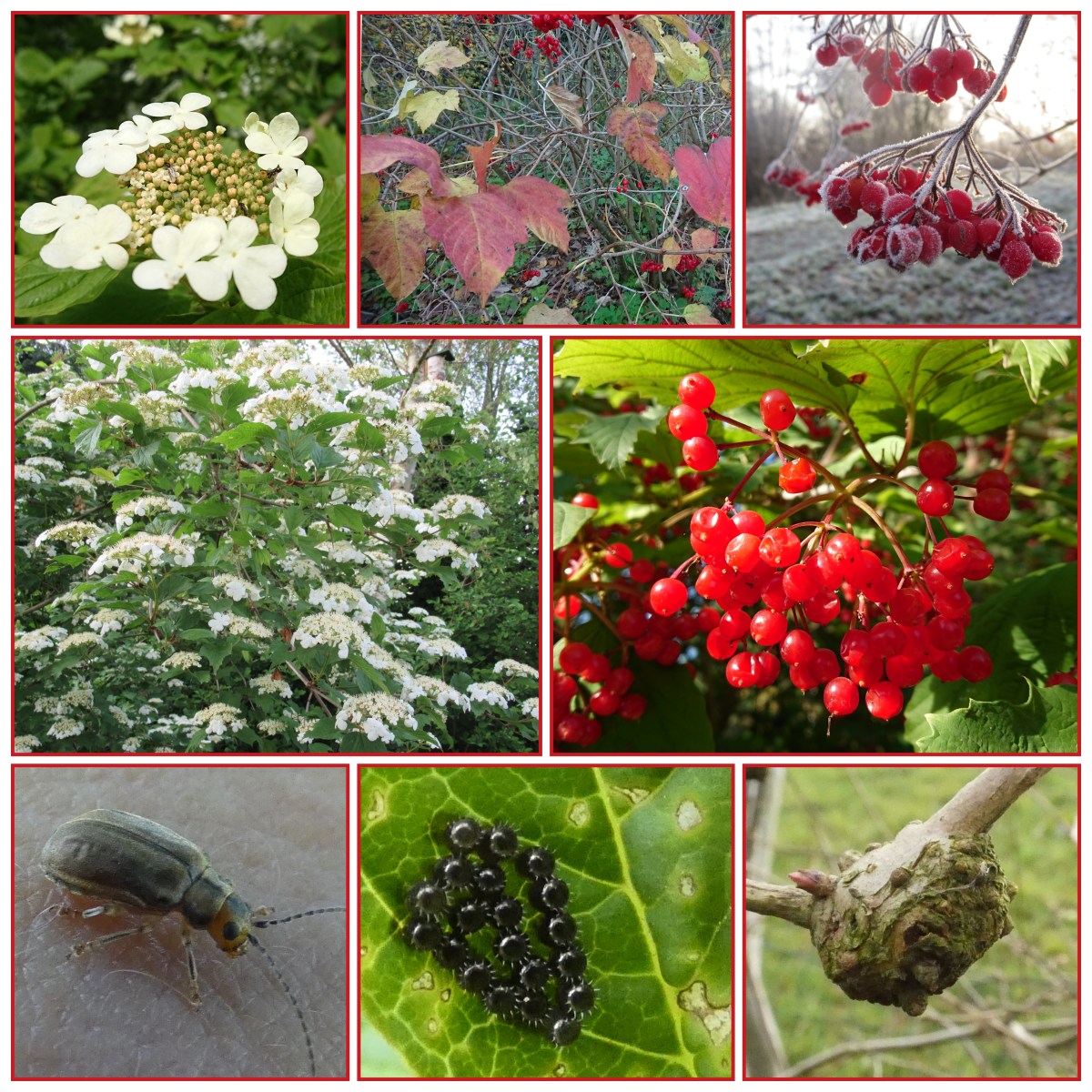 De witte bloemen van de Gelderse roos staan in vlakke tuilen. Als je goed kijkt, zie je twee soorten bloemen (foto linksboven). De randbloemen zijn relatief groot en hebben als taak om insecten te lokken. Meeldraden en stampers ontbreken. De kleine bloemen middenin zijn de vruchtbare bloemen. Kevers, zweefvliegen en ook enkele vlindersoorten komen hier nectar en stuifmeel halen. De struik bloeit eind mei, begin juni.
