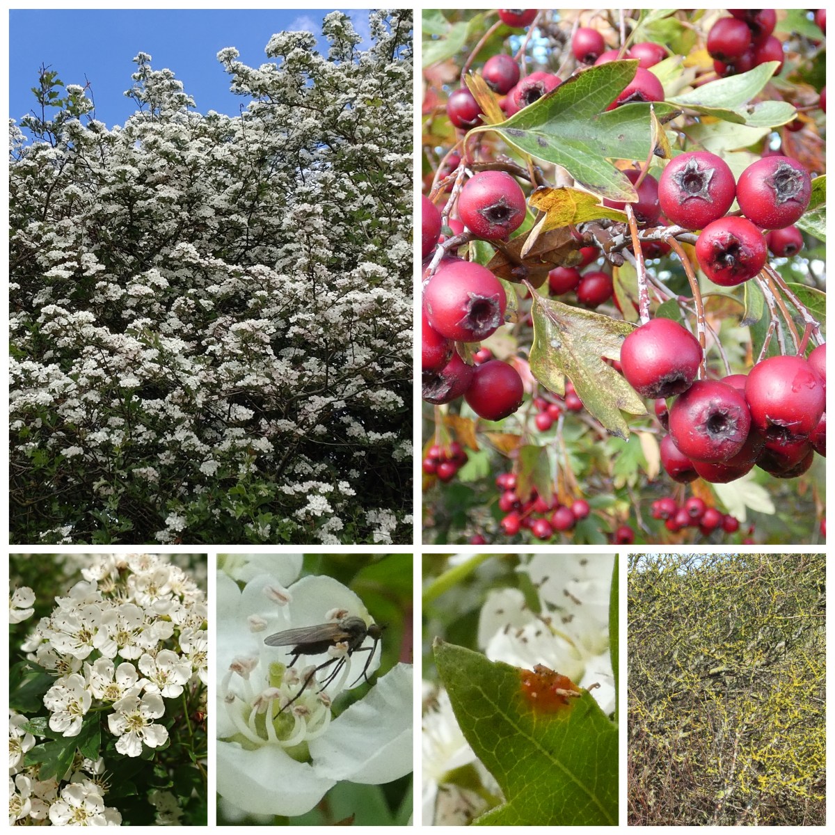 Scheefgezakte meidoorns in de duinen kunnen vaak flink begroeid zijn met korst-, blad- en levermossen (foto rechtsonder). Er zijn verschillende zwammen die je in de buurt van meidoorns kunt aantreffen. Op afgevallen bessen kun je bijvoorbeeld vanaf mei de meidoornbesgeweizwam en het meidoornrotkelkje vinden. Nog nooit gezien, dus daar ga ik komend voorjaar eens naar op zoek. Ook is er een roest die je op meidoorn kunt vinden: de meidoorn-jeneverbesroet (foto onderaan).