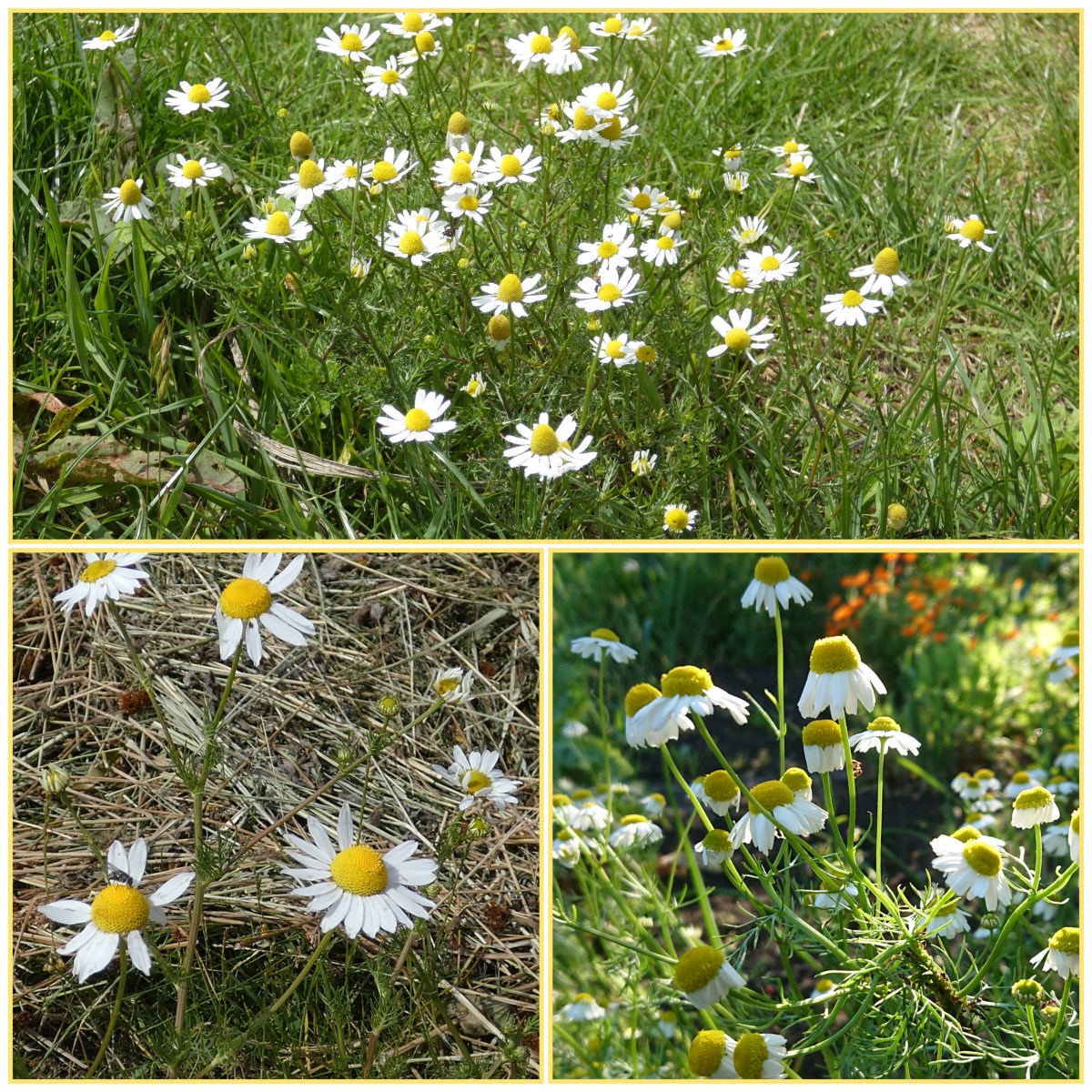 Ook echte kamille (foto rechtsonder) die veel op reukeloze kamille lijkt, zou je bloeiend kunnen aantreffen, al scoorde die de afgelopen jaren lager bij de Eindejaars Plantenjacht. Als je aan de plant ruikt, merk je direct het verschil: echte kamille ruikt (meestal) sterk en reukeloze kamille slechts zwak naar kamille. Het beste ruik je dat als je een bloem kneust.