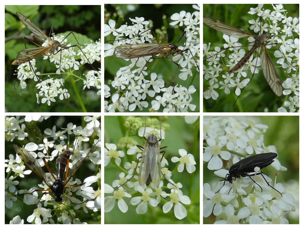 Hier zie je zes muggensoorten. Bovenaan drie langpootmuggen: de lentelangpoot, de hoefijzertijger en nog een langpootmuggensoort (Tipula spec.). Daaronder zie je de viervlekglansmug, een van de vele soorten dansmuggen en een rouwmug.