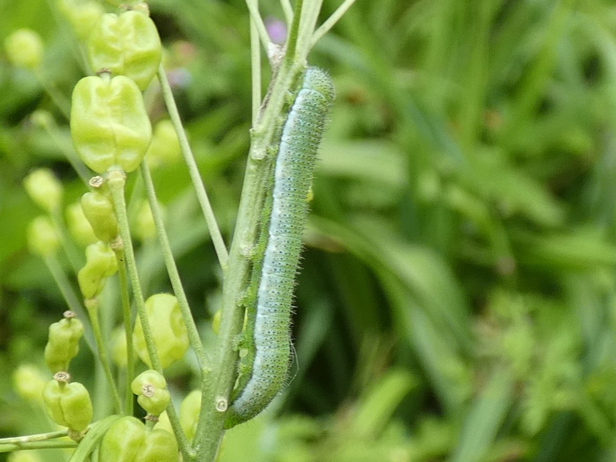 Op 5 mei vond ik de eerste twee eitjes op look-zonder-look. En gisteren vond ik twee rupsen: een op mierikswortel (foto) en een op look-zonder-look. Daar eten ze inmiddels van de hauwtjes want de planten zijn uitgebloeid. Half juni trekken de rupsen naar een boom of struik en daar wachten ze als pop (met de vorm van een stekel) het voorjaar af. Wil je de vlinder zien vliegen, dan zul je tot maart/april moeten wachten.