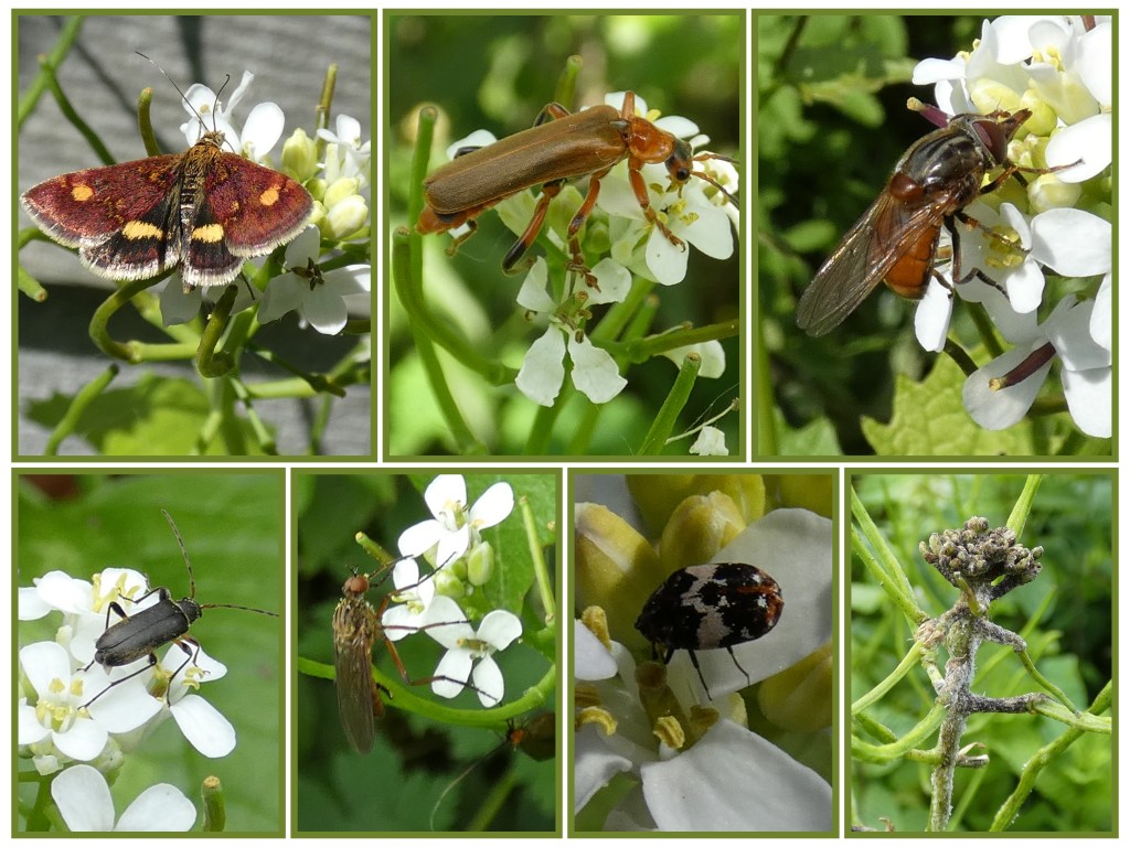 Verder zijn er natuurlijk veel insecten die de bloemen van look-zonder-look bezoeken. In de collage zie je bovenaan: muntvlindertje, bleekgele weekschildkever en gewone snuitvlieg. Daaronder zie je de gewone bloesemboktor, akkerdisteldansvlieg en vogelnestkever. De laatste foto is van een schimmel die de bloemen en hauwtjes aantast. Op deze plant had ik het eerste eitje van het oranjetipje gevonden. Geen idee wat er met de eventuele rups is gebeurd.