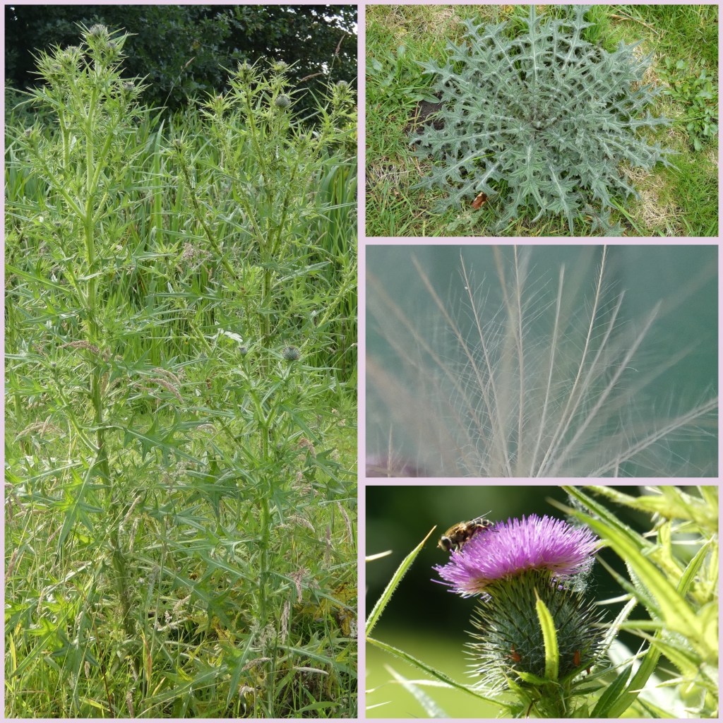 Allereerst iets over de speerdistel zelf. Op de foto links zie je het ‘studieobject’. Op de foto rechtsboven zie je een rozet van dezelfde plant van afgelopen maart. De speerdistel is in principe een tweejarige plant die afsterft als hij gebloeid heeft en zaad heeft gevormd.