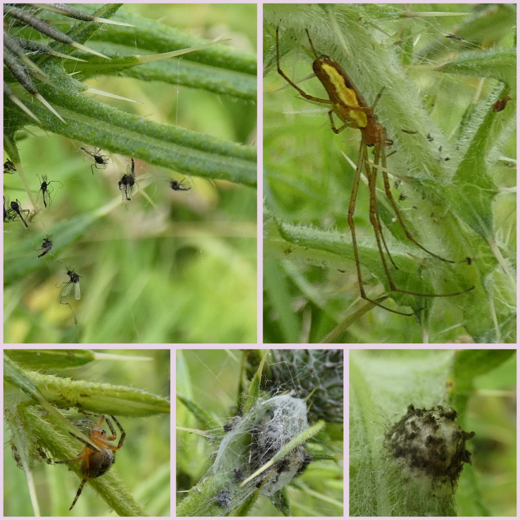 Spinnen vangen zowel de (vliegende) bladluizen als andere vliegende beestjes in hun web. Rechts zie je een strekspin en daaronder haar eikapsel waarvan ik meerdere op de speerdistel zag. Verder nog een jonge kruisspin en een onbekende spin met haar weefsel boven in de plant.