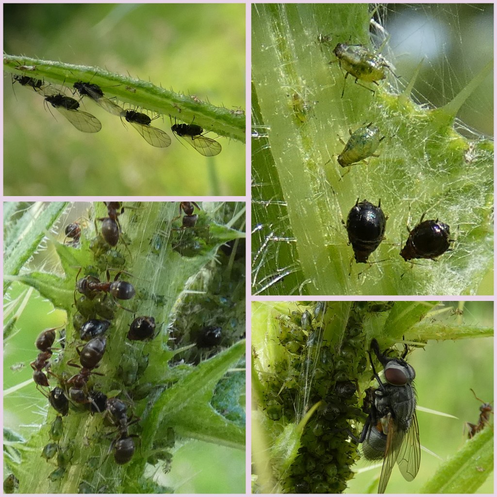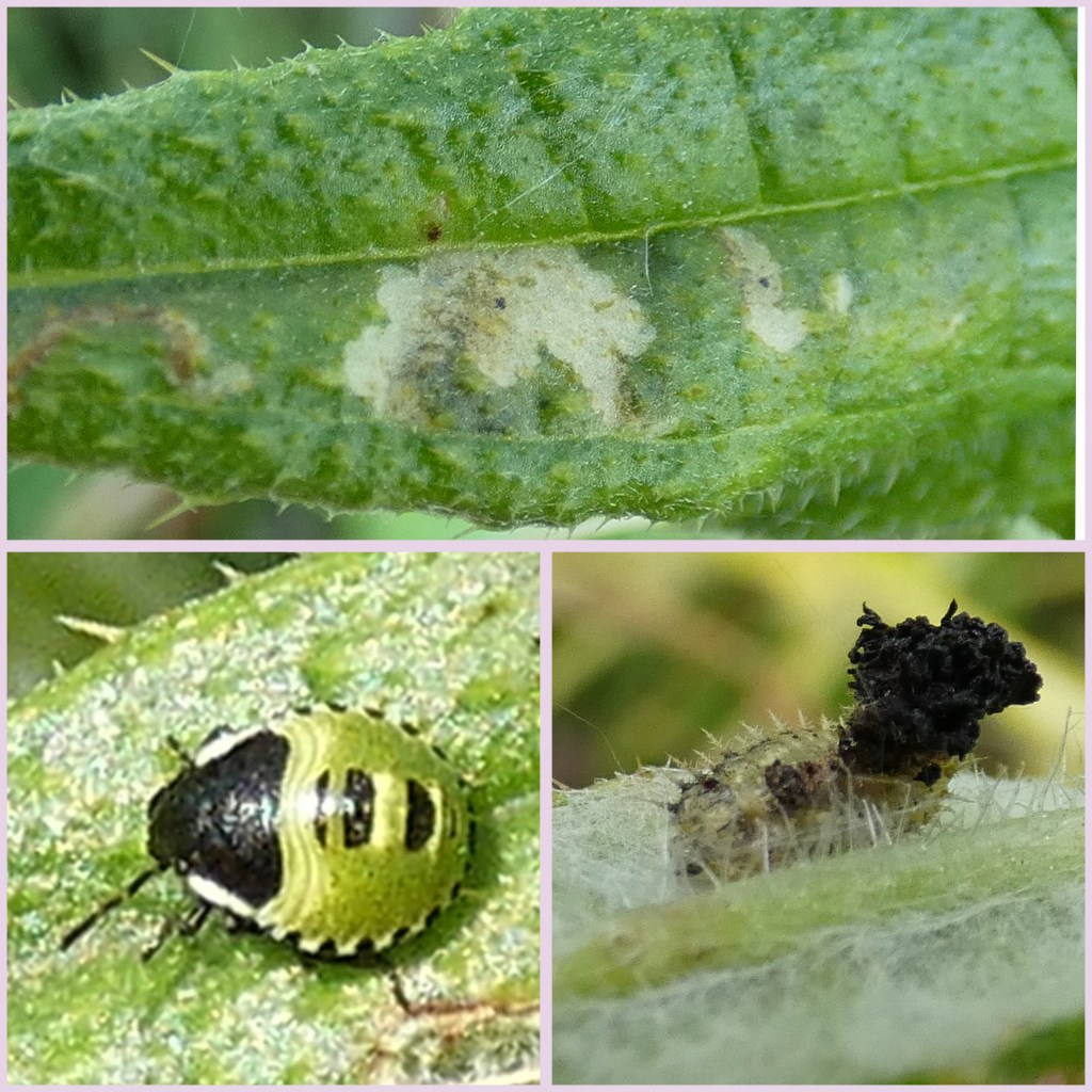 Niet alleen bladluizen eten van de plant. Ik heb geen rupsen gezien; rupsen van o.a. de distelvlinder en het distelhermelijntje zijn er pas in de zomer. Wel zag ik mijnen van mineervliegjes, een nymf van de groene schildwants en de larve van een schildpadtor (die zich camoufleert met zijn uitwerpselen en vervellingshuidjes).
