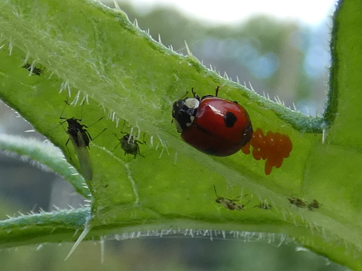 Het begon op 11 juni. Op die dag vielen me de vele insecten op die zich op en rond een speerdistel in onze tuin bevonden. Toen ik wat beter keek, zag ik dat deze speerdistel vol zat met bladluizen. Dat trok allerlei insecten aan die van de honingdauw (afscheiding van bladluizen) snoepen of die bladluizen eten. Ook zag ik een tweestippelig lieveheersbeestje haar eitjes leggen aan de onderkant van een blad. Het leek me leuk om te volgen wanneer die eitjes zouden uitkomen en om gelijk naar alle andere beestjes op en rond de speerdistel te kijken. Op 20 juni verscheen de eerste larve van het tweestippelig lieveheersbeestje. Op 24 juni werd het eerste bloemhoofdje paars. Een mooi moment om een verslagje te maken van al mijn waarnemingen gedurende die twee weken.