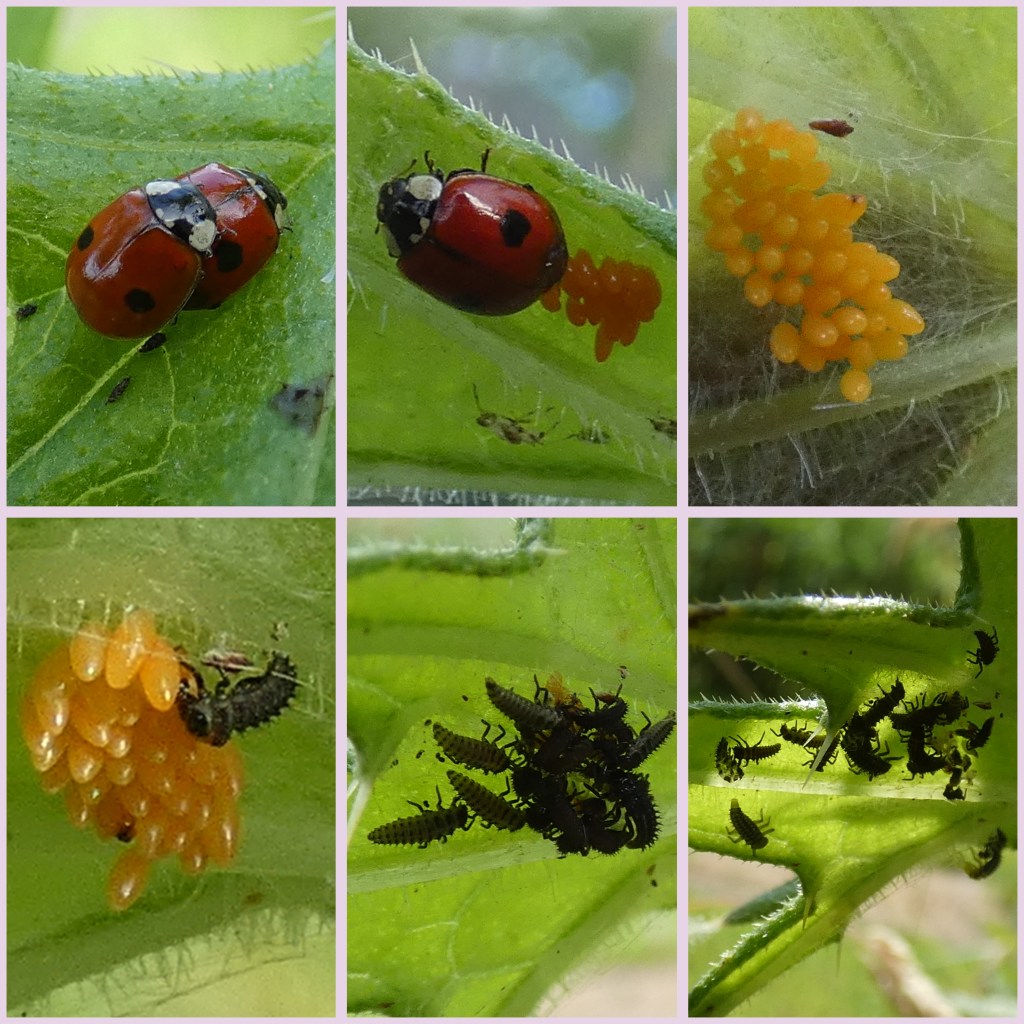 Op de eerste foto paren er twee; dit zijn andere dan de eierleggende op de tweede foto. Op 11 juni werden de eitjes gelegd, op 20 juni verscheen de eerste larve. Eerst bleven de larven nog bij elkaar zitten en daarna waaierden ze over de plant uit. De larven eten de resten van hun eitje op en ik meen op de laatste foto ook een larve te zien die een broertje of zusje leegzuigt. Meer over lieveheersbeestjes vind je hier.
