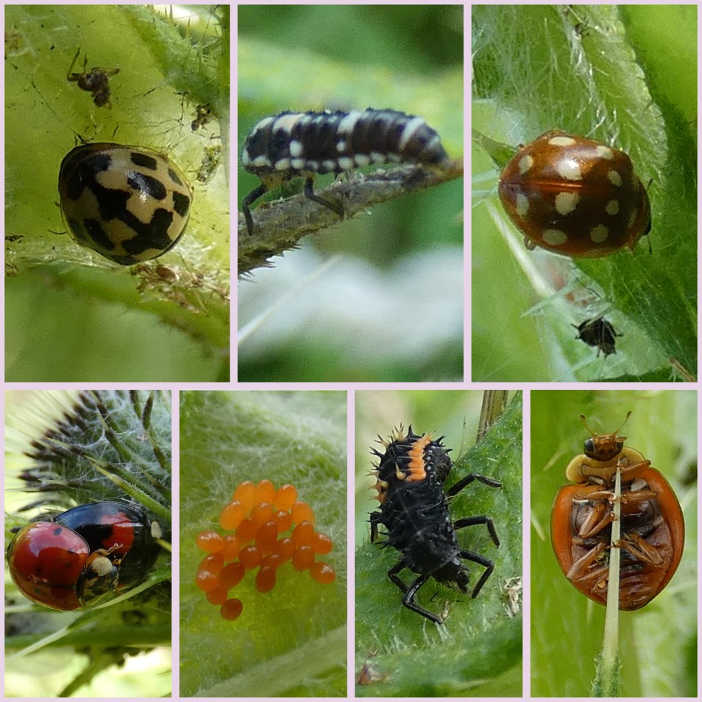 Bovenaan het schaakbordlieveheersbeestje en zijn larve en daarnaast het roomvleklieveheersbeestje. Onderaan zie je het Aziatische lieveheersbeestje met imago’s, eitjes en larven.