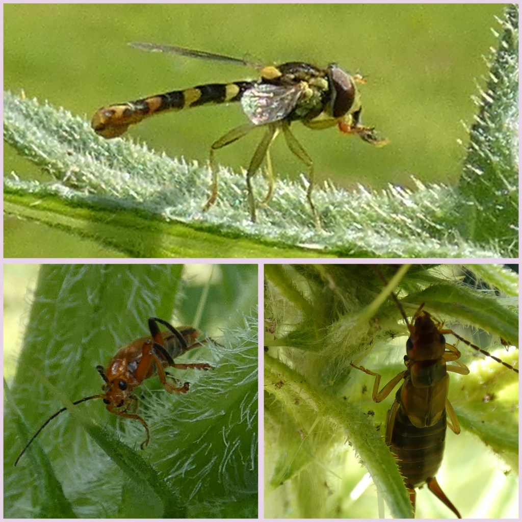 Ik heb opvallend veel wespensoorten gezien. Hierbij gaat het zowel om parasitaire wespen die parasiteren op bladluizen of larven, als om bladwespen waarvan de larven van de plant eten. In de collage zie je bovenaan een bladluizendoder (what’s in a name), een wesp die parasiteert op een larve en een opvallende sluipwesp (Glyphicnemis profligator). Daaronder nog drie afbeeldingen van sluipwespen.
