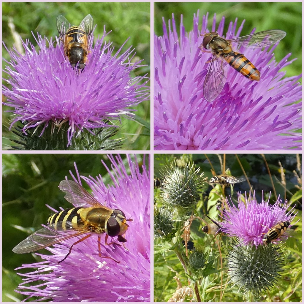 Ook hommels zijn gek op de nectar en het stuifmeel van de speerdistel. Bovenaan zie je een boomhommel, hommels van de aardhommelgroep en een tuinhommel. Onderaan zie je links een akkerhommel (meest voorkomende hommel in onze tuin) en rechts een mannetje van de steenhommel. Hij steekt een van zijn middelste pootjes omhoog. Dat is een waarschuwingsteken; blijkbaar kwam ik met de camera te dichtbij.