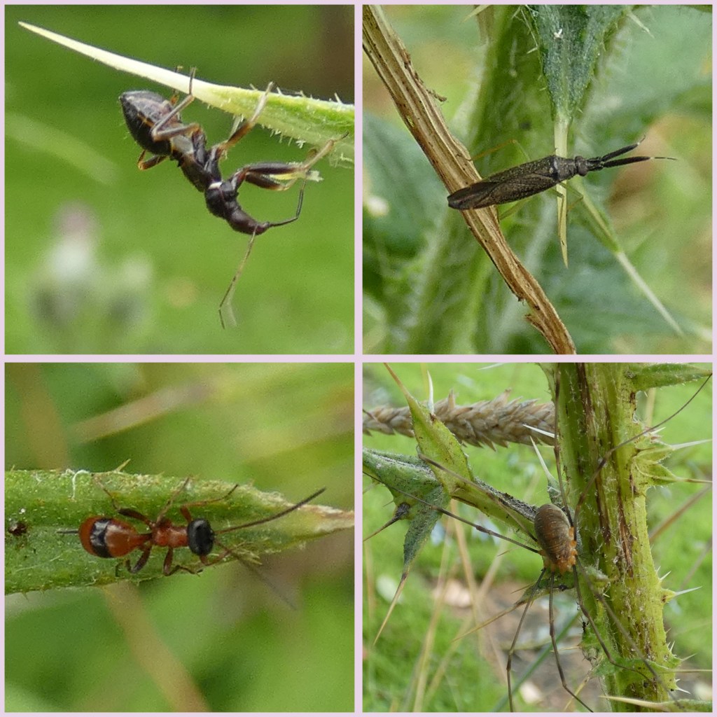 Bovenaan zie je twee wantsen: miersikkelwants en slanke diksprietblindwants. Daaronder een sluipwesp (Gelis melanocephalus) en rode hooiwagen.