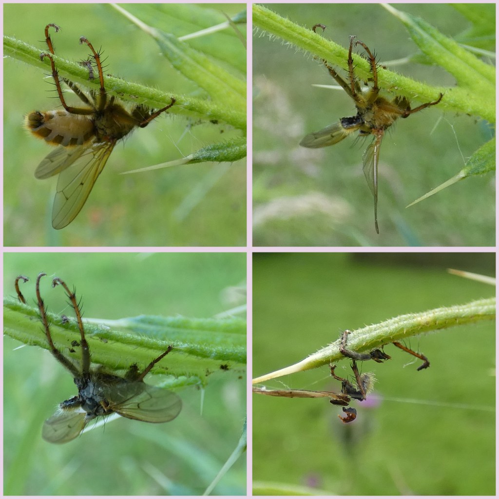 Tenslotte heb ik het vergaan van twee strontvliegen gevolgd die besmet waren geraakt met een schimmel (Entomophthora muscae). Een is met de harde wind begin deze maand van de plant gewaaid. Van de andere resten nog de pootjes. Wat moet die vlieg zich vastgeklampt hebben aan de plant!